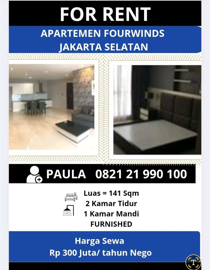 Apartemen Four Winds Rp 275 Juta / Tahun Nego Apartemen 2 Kamar Tidur Furnished