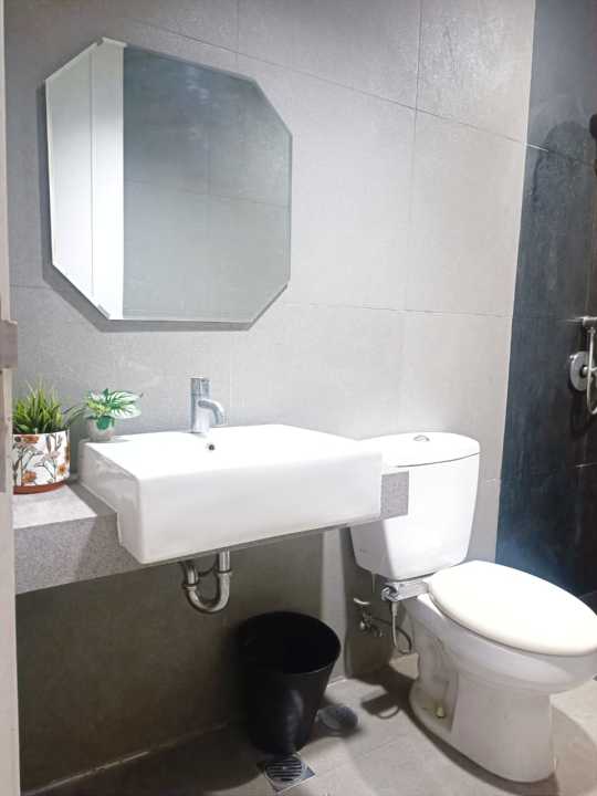 Kamar mandi tengah dg cermin, keset, gantungan pakaian, water heater, hexos