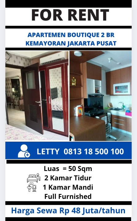 Apartemen Boutique Kemayoran 2 Br Rp 48 Juta / Tahun Nego