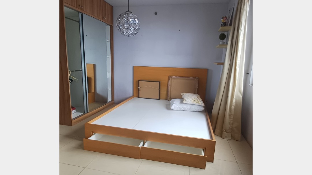 (wifi, tv, kulkas, AC, divan tmpt tidur utama, tmpt tidur kamar anak + spring bed 120x200, sofa, kitchen set masih sgt bagus, kompor, shower heater, wardrobe)