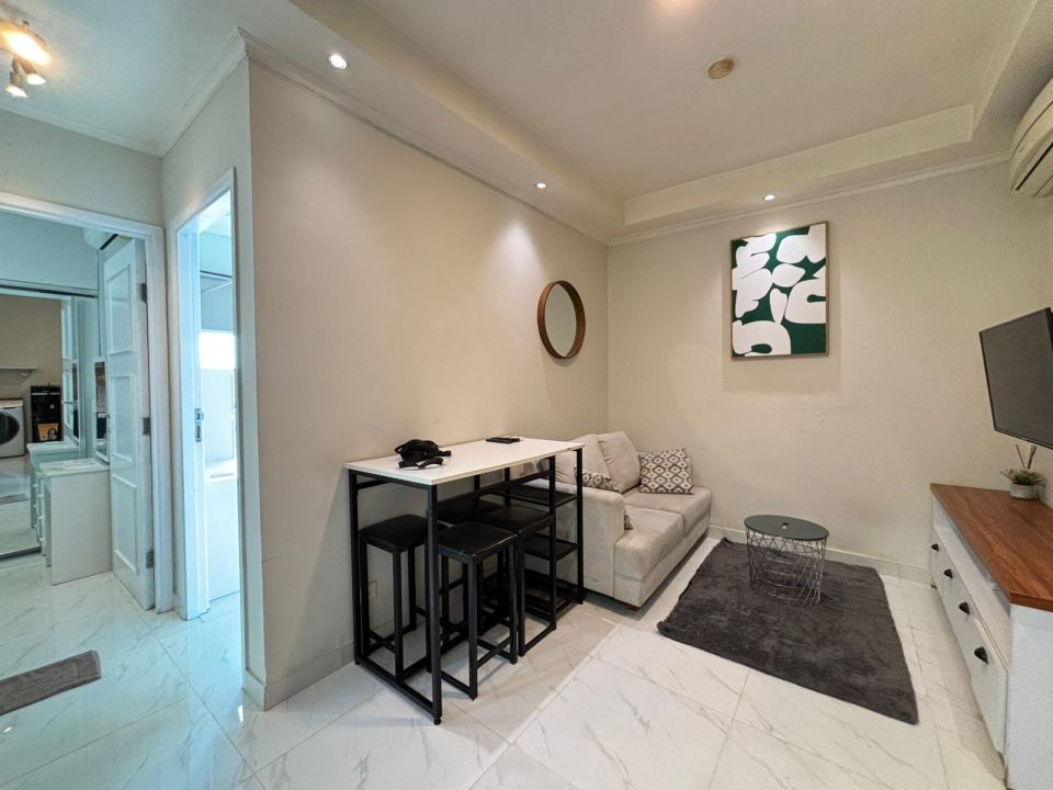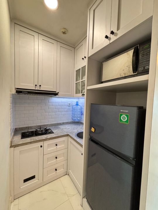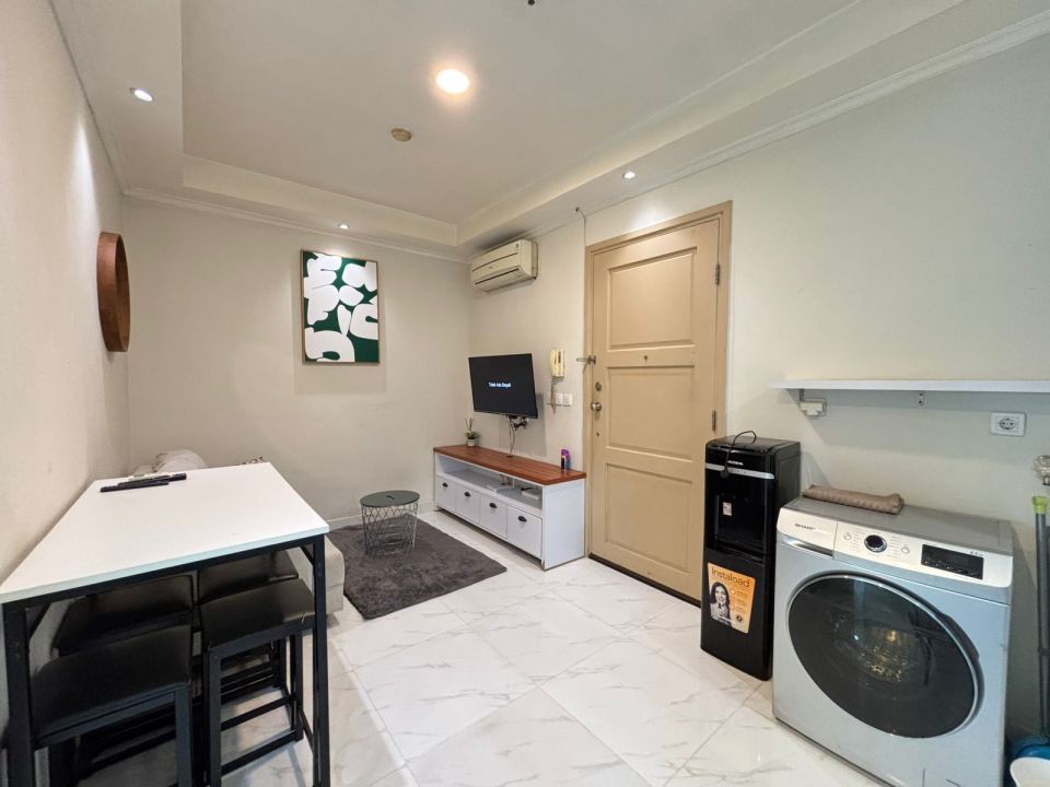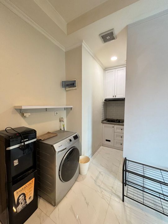 Sudah di lengkapi kitchen set, kulkas, microwave , Dispenser, washing machine, sofa , Smart TV dan lain lain