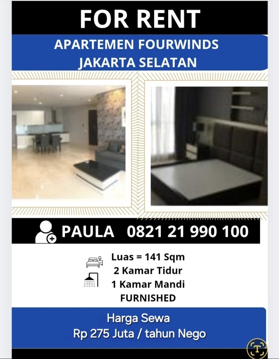 Selamat datang di Apartemen Fourwinds Kebayoran Lama, hunian nyaman dan modern yang terletak di jantung Kota Jakarta Selatan. Dengan 2 kamar tidur yang luas dan berbagai fasilitas premium, apartemen ini menawarkan gaya hidup yang ideal bagi Anda yang mencari kenyamanan dan kemudahan akses di lingkungan perkotaan.