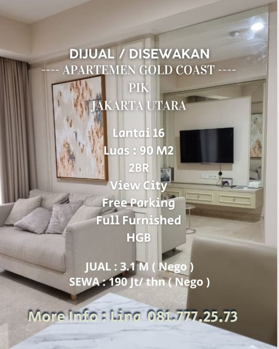 Dijual/Disewakan Apartemen Gold Coast 2Br Furnished, Jakarta Utara