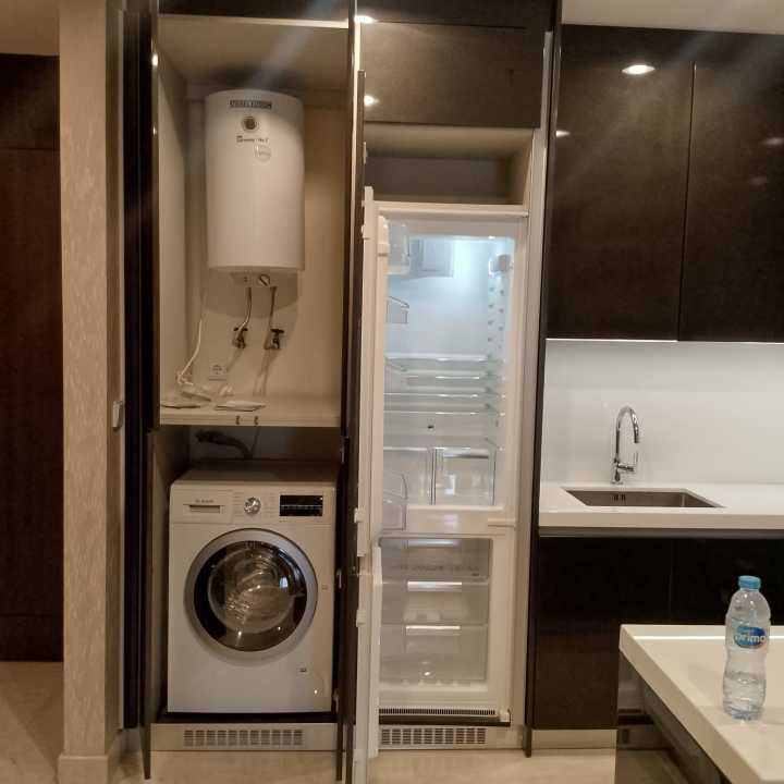 Fasilitas dalam unit seperti dapur lengkap, AC, TV, dan furniture
