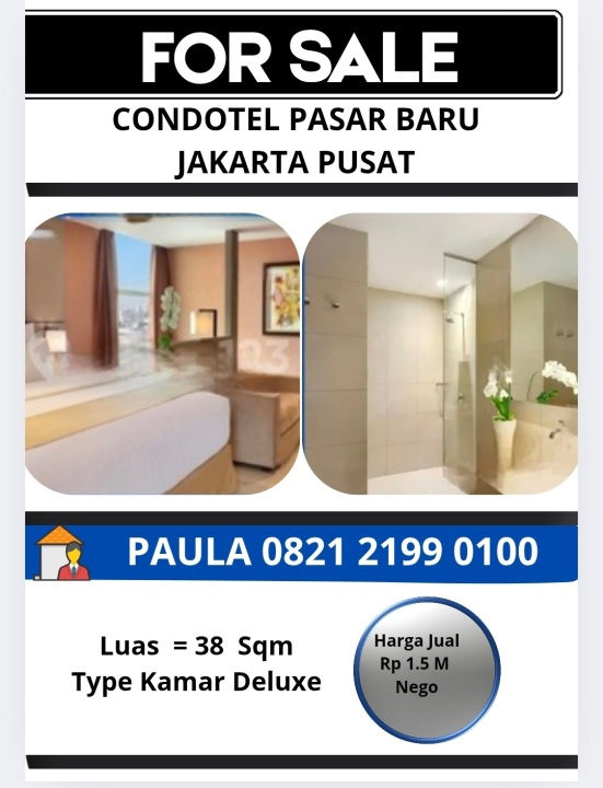 Kesempatan memiliki apartemen di Pasar Baru, Jakarta Pusat, kamar tidur, luas 38m². Harga kompetitif: 1,5 Miliar. Dekat fasilitas umum.