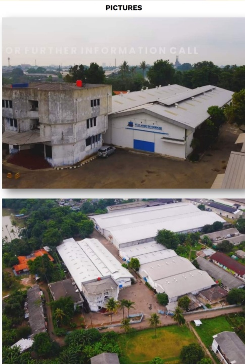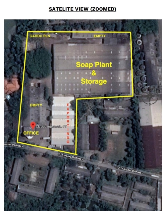 Pabrik sabun & gudang penyimpanan dengan banyak area untuk parkir kendaraan besar dan kecil. Memiliki ruang hijau serta area tambahan yang dapat digunakan untuk perluasan jika diperlukan.