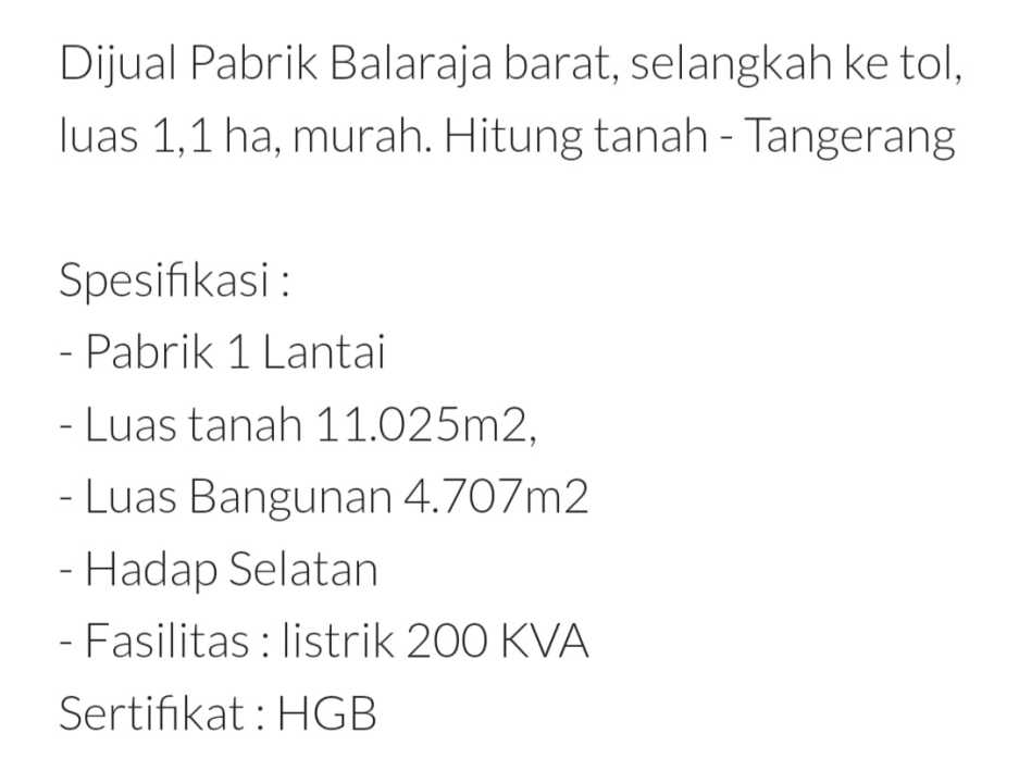 *Dijual eks pabrik hadap utara kawasan Akong, karet kec .Sepatan - Tangerang*