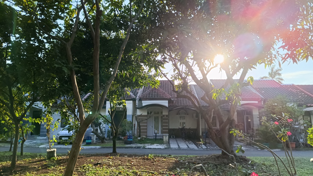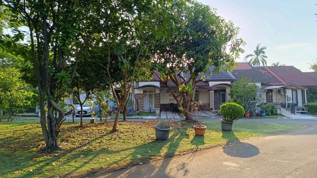 Rumah rapi hadap timur depan taman, dilengkapi pergola dan dak jemuran.
