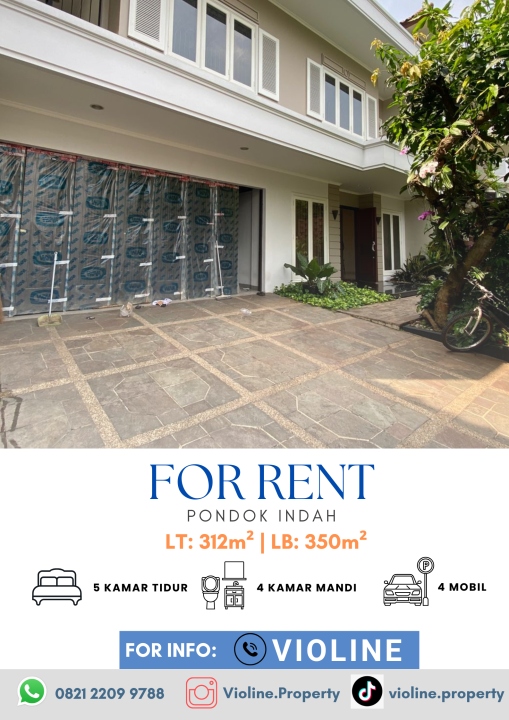 Rumah siap huni disewakan di kawasan Pondok Indah, Jakarta Selatan, LT/LB: 312/350m², 3 KT, 3 KM. Lokasi strategis dengan harga menarik: 625 Juta /tahun.