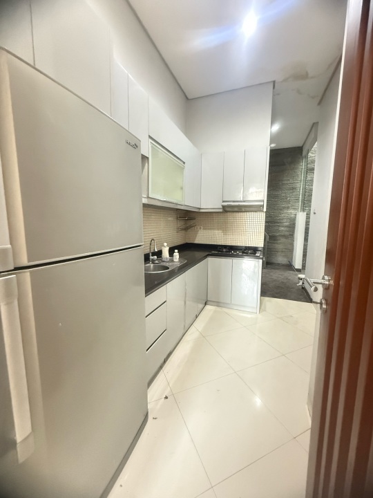 Ruang tamu luas. Ada kitchen set yang masih baru siap di gunakan.