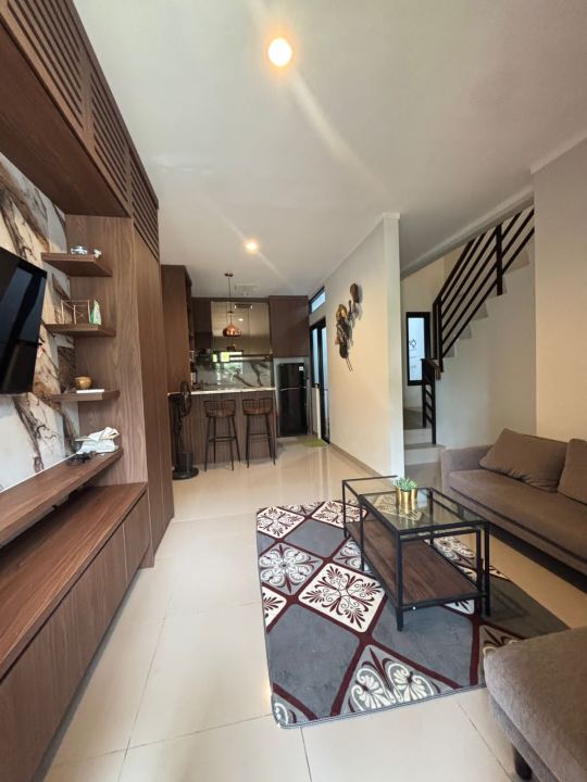 Peralatan : AC 4 unit (1 living room, 3 kamar tidur), tv 55 inch, sofa, kitchen set dan pantry lengkap, dll