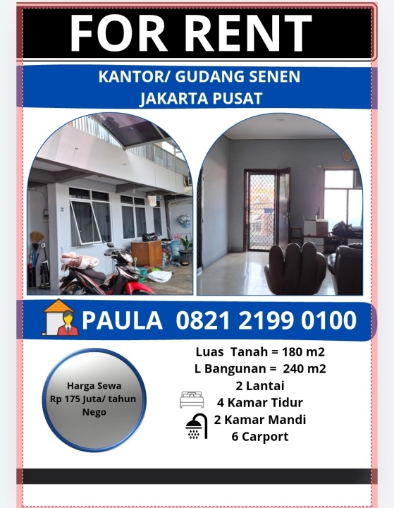 Disewakan Gudang/ Kantor Senen Jakarta Pusat Rumah Bagus di Senen