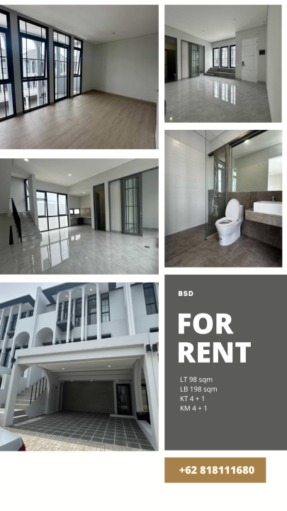 Disewakan rumah minimalis di BSD, Tangerang Selatan. Hunian praktis dengan 4 KT & 4 KM. Luas tanah 98m², harga sangat terjangkau 120 Juta /tahun. Lingkungan nyaman.