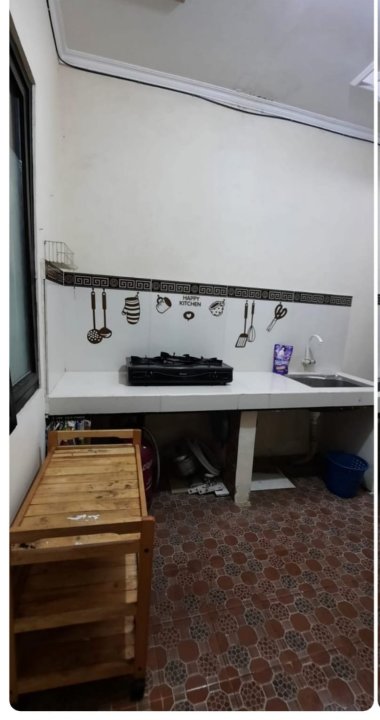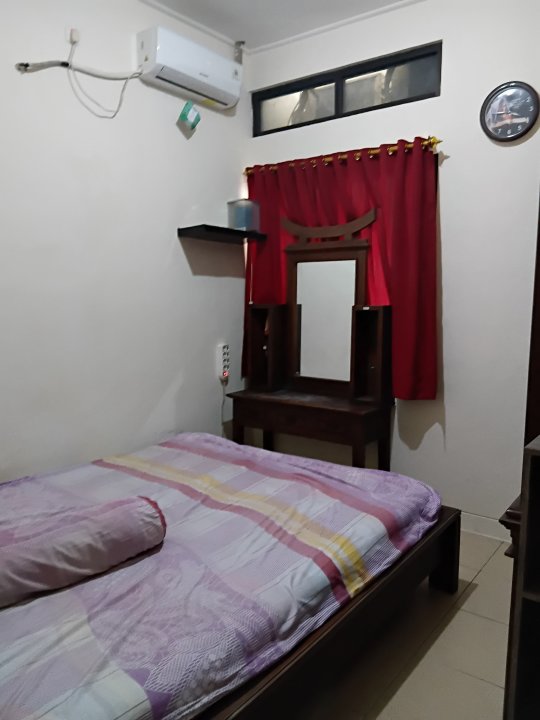 - 1 kamar utama (bisa untuk kamar anak) terdapat AC 1/2 pk; dipan & kasur ukuran 120×200; lemari pakaian Jati 2 pintu