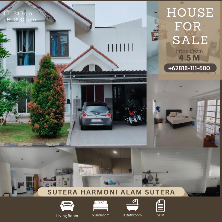 Penawaran terbatas rumah berkelas di Alam Sutera, Tangerang. Desain elegan dengan LT/LB: 240/300m², 5 KT & 3 KM. Harga spesial: 4,5 Miliar. Cocok untuk hunian atau investasi.