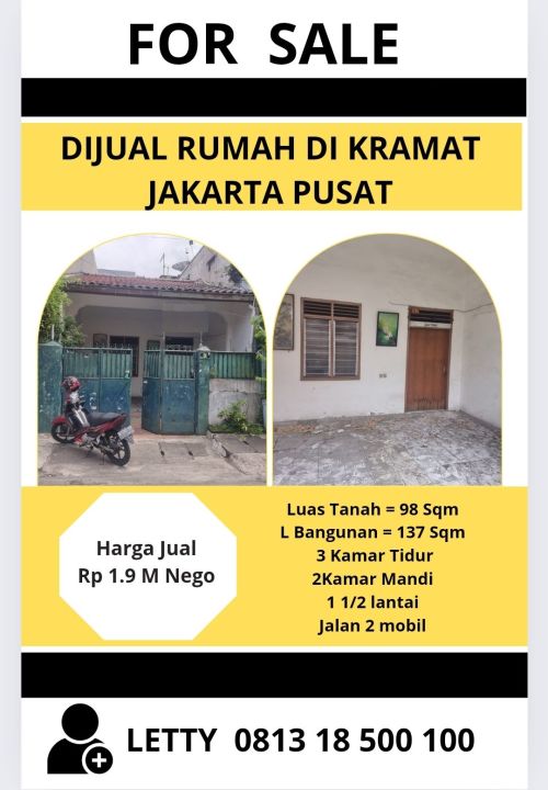 Rumah keluarga di lokasi strategis Kramat, Jakarta Pusat. Dengan 3 KT dan 2 KM, LT 98m², LB 137m². Harga terbaik 1,9 Miliar. Dekat fasilitas umum.