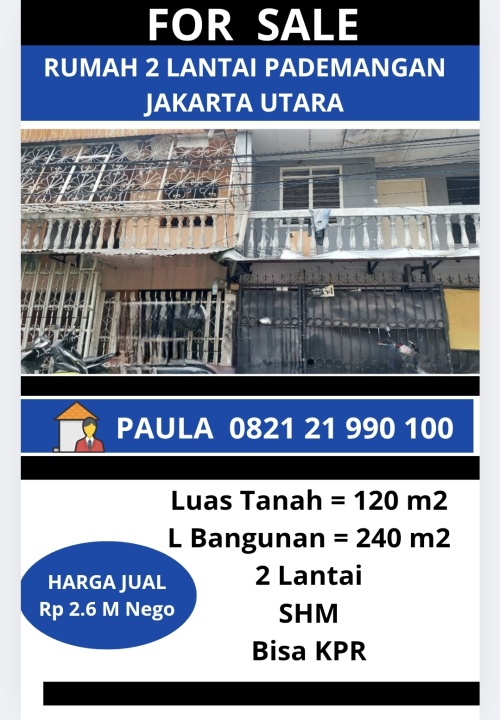 Rumah luxury siap huni di Pademangan, Jakarta Utara. Hunian elit dengan 2 kamar tidur dan 2 kamar mandi, LT 120m², LB 240m². Harga eksklusif: 2,6 Miliar. Fasilitas lengkap.