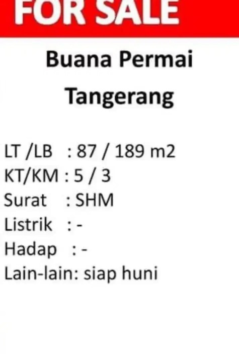 Promo terbatas rumah idaman di Cipondoh, Tangerang. Luas tanah 87m² dengan bangunan 189m², terdiri dari 5 KT & 3 KM. Harga kompetitif di kelasnya: 2 Miliar. Lingkungan nyaman.