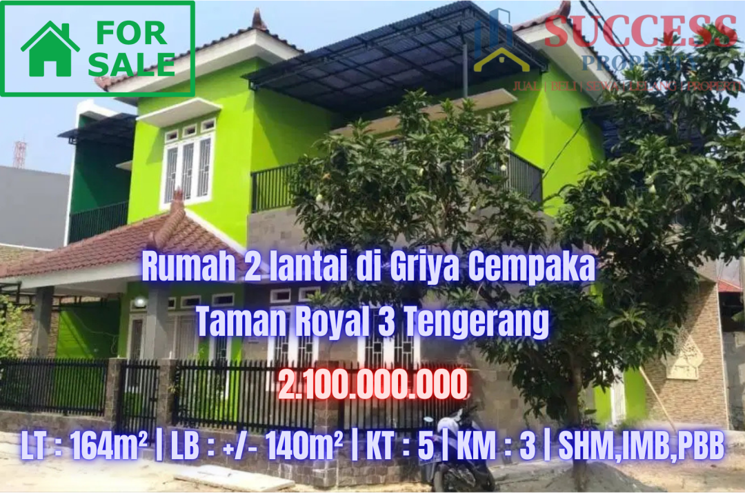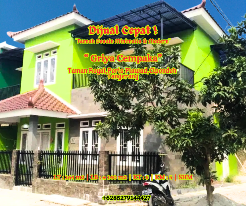 Rumah minimalis di kawasan Taman Royal, Tangerang. Luas tanah 164m² dan luas bangunan 280m², dilengkapi 5 KT & 3 KM. Harga mulai 2,1 Miliar. Proses cepat.