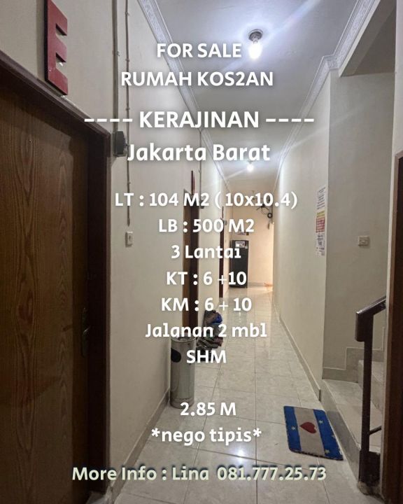 Dijual Rumah Kos2an 3 Lantai Di Kerajinan, Jakarta Barat