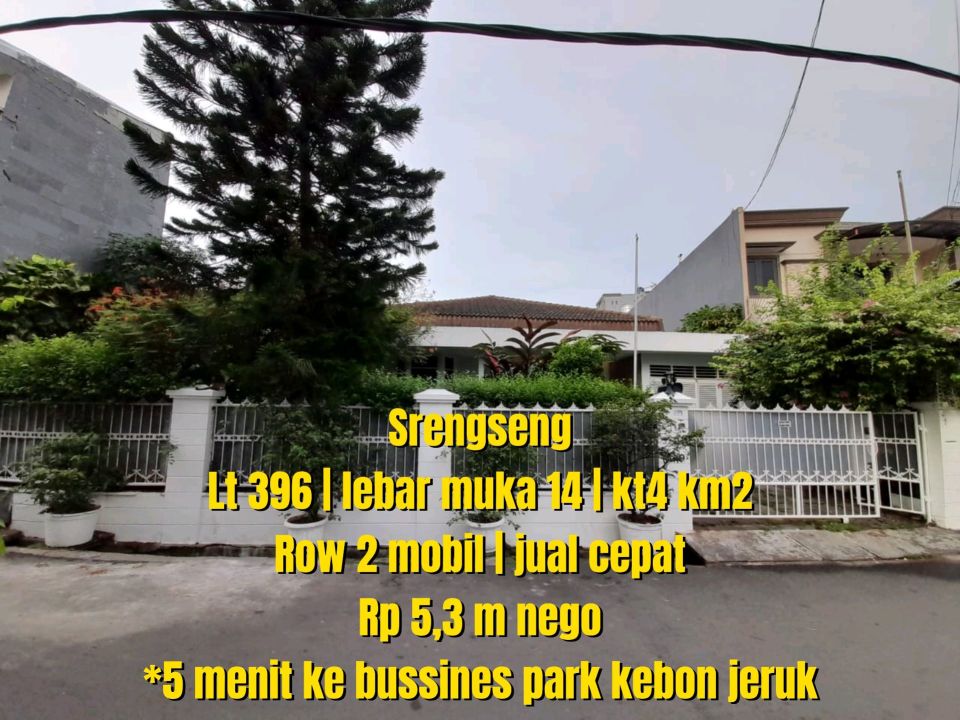 Tersedia rumah mewah di kawasan elit Srengseng, Jakarta Barat. Dengan desain elegan, LT 396m², LB 250m², terdiri dari 4 KT & 2 KM. Harga premium: 5,3 Miliar. Akses mudah.
