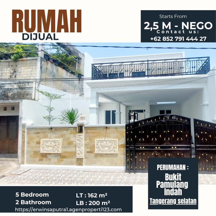 Miliki rumah di Pamulang, Tangerang Selatan. Memiliki 5 kamar tidur, 2 kamar mandi, luas tanah 162m², luas bangunan 200m². Harga spesial: 2,5 Miliar. Lingkungan nyaman.
