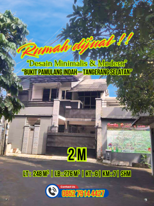 Promo terbatas rumah idaman di Pamulang, Tangerang Selatan. Luas tanah 248m² dengan bangunan 276m², terdiri dari 7 KT & 6 KM. Harga terbaik di kelasnya: 2 Miliar. Lingkungan nyaman.