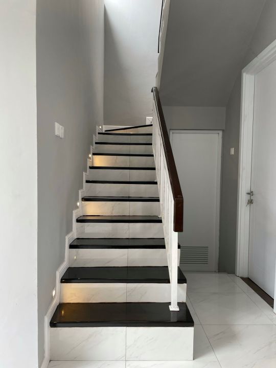 Lantai sudah full granit dan area tangga menggunakan parkit.