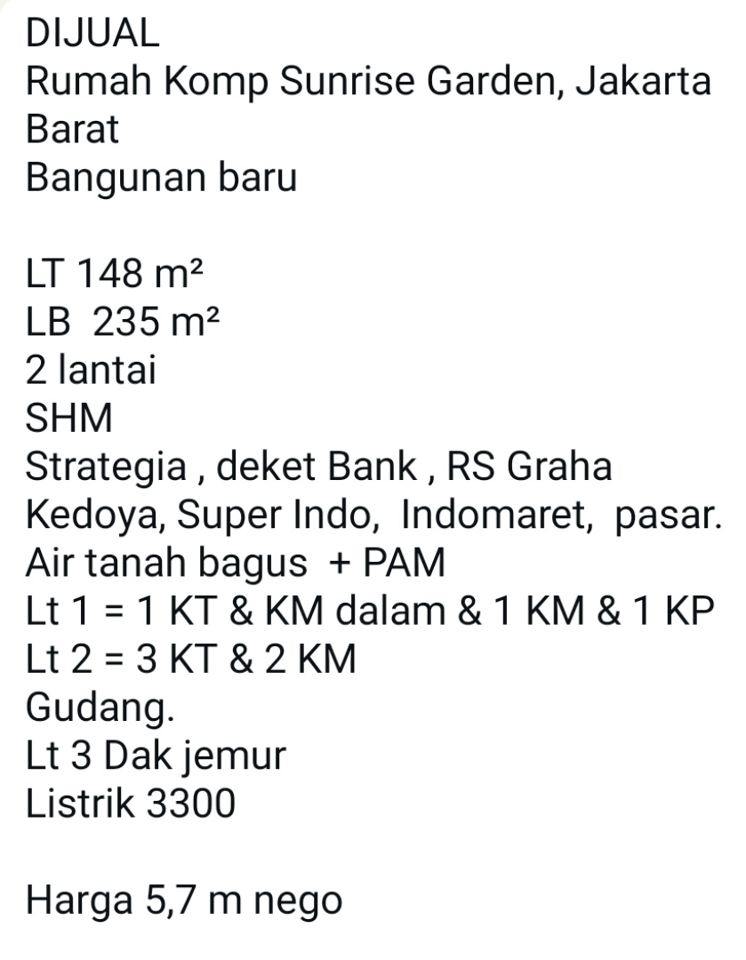 Rumah baru siap huni dengan lahan yang luas di area berkembang Sunrise Garden, Jakarta Barat. Terdiri dari 4 kamar tidur dan 3 kamar mandi hanya dengan Rp 5,700,000,000.