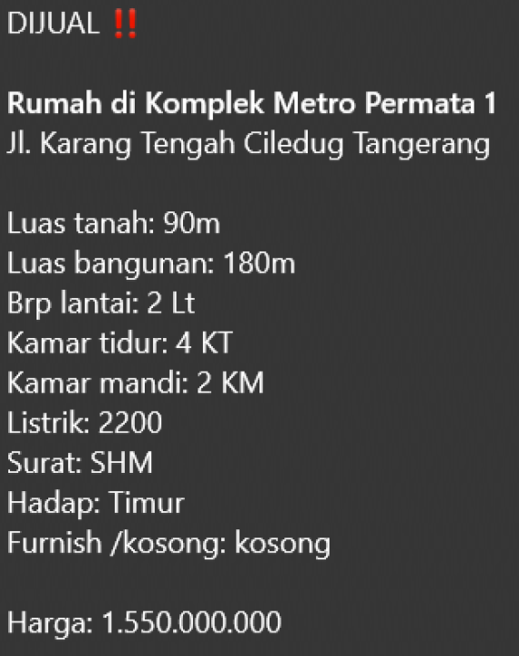Dijual rumah di Ciledug, Tangerang. Hunian nyaman dengan 4 kamar tidur dan 2 kamar mandi. LT 90m², LB 180m². Harga kompetitif 1,55 Miliar. Lokasi strategis.