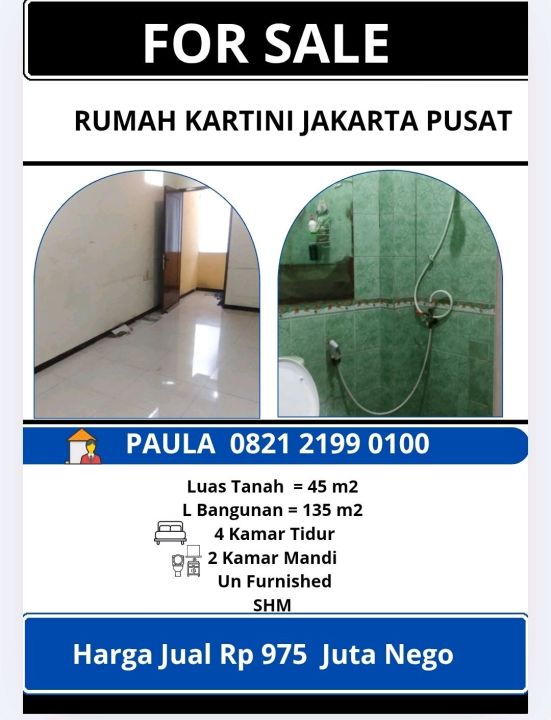 Rumah keluarga di lokasi strategis Kartini, Jakarta Pusat. Dengan 4 KT dan 2 KM, LT 45m², LB 135m². Harga terbaik 975 Juta. Dekat fasilitas umum.