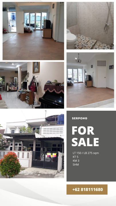 Miliki rumah di Serpong Utara, Tangerang Selatan. Memiliki 5 kamar tidur, 3 kamar mandi, luas tanah 150m², luas bangunan 275m². Harga spesial: 1,9 Miliar. Lingkungan nyaman.