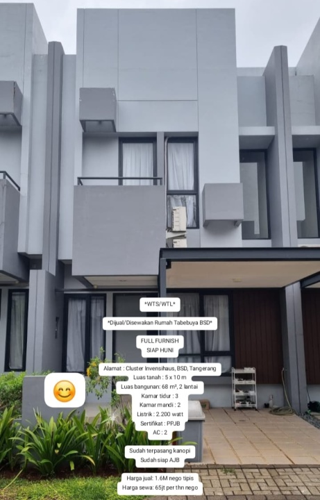 Miliki rumah di BSD City, Tangerang. Memiliki 3 kamar tidur, 2 kamar mandi, luas tanah 50m², luas bangunan 68m². Harga spesial: 1,6 Miliar. Lingkungan nyaman.