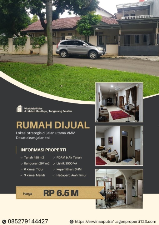 Dijual rumah mewah di kawasan elit Serpong Villa Melati Mas, Tangerang Selatan. Dengan desain elegan, LT 480m², LB 297m², terdiri dari 6 KT & 3 KM. Harga premium: 6,5 Miliar. Akses mudah.