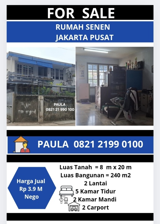 Kesempatan emas memiliki rumah elit di Senen, Jakarta Pusat. Luas tanah 160m², bangunan 250m², 5 KT & 2 KM. Harga terbaik di kelasnya: 3,9 Miliar. Dekat pusat kota dan fasilitas premium.