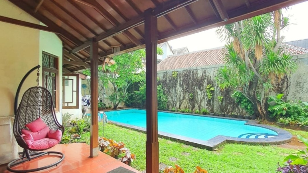 Properti di atas lahan seluas 660 meter2 ini, memeiliki taman di belakang rumah dengan kolam renang.