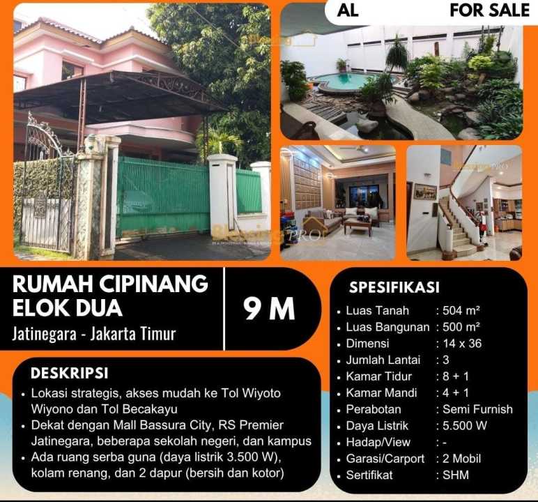 Rumah prestisius siap huni di Cipinang, Jakarta Timur. Hunian elit dengan 8 kamar tidur dan 4 kamar mandi, LT 504m², LB 500m². Harga eksklusif: 9 Miliar. Fasilitas lengkap.