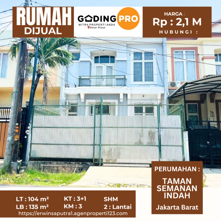 Miliki rumah di Semanan, Jakarta Barat. Memiliki 4 kamar tidur, 3 kamar mandi, luas tanah 104m², luas bangunan 135m². Harga spesial: 2,1 Miliar. Lingkungan aman.
