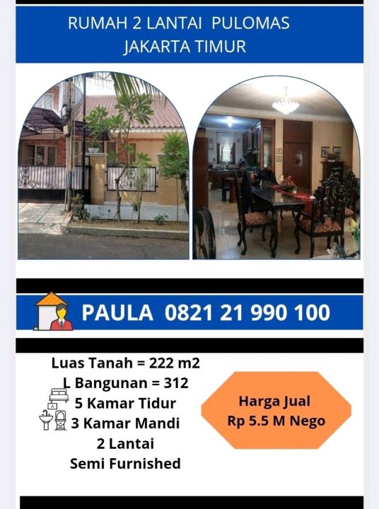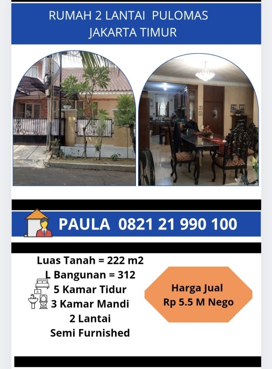 Dijual rumah mewah di kawasan elit Pulomas, Jakarta Timur. Dengan desain elegan, LT 222m², LB 312m², terdiri dari 5 KT & 3 KM. Harga premium: 5,25 Miliar. Akses mudah.