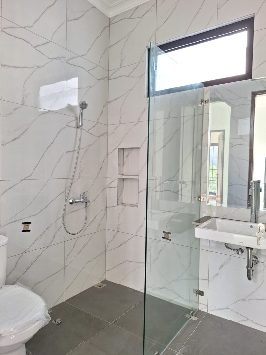 Lantai kamar tidur SPC , Kloset KOHLER, lantai HT slab besar ukuran 90x180, dinding KM HT 60x120