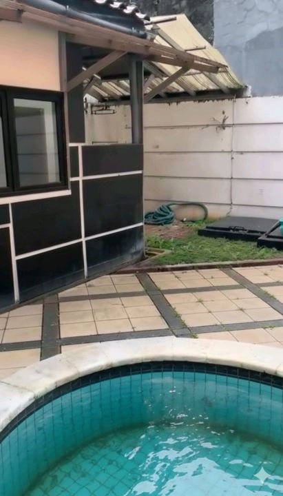 rumah 1 lantai ini mempunyai kolam renang .