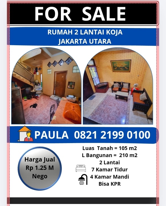 Dijual rumah di Koja, Jakarta Utara. Hunian modern dengan 7 kamar tidur dan 4 kamar mandi. LT 105m², LB 210m². Harga terjangkau 1,25 Miliar. Akses mudah ke fasilitas umum.