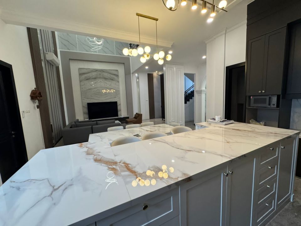 - All quadra stone untuk lantai tangga, marmer backdrop tv dan furniture