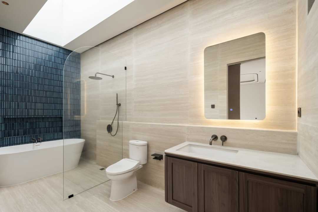 Luxury Bathroom feature : Quadra Stone & Cabinetry, Frameless Shower Screen, Gunmetal Fittings, Toto Touchless Toilet, Freestanding Bath on Master Ensuite & Skylight.