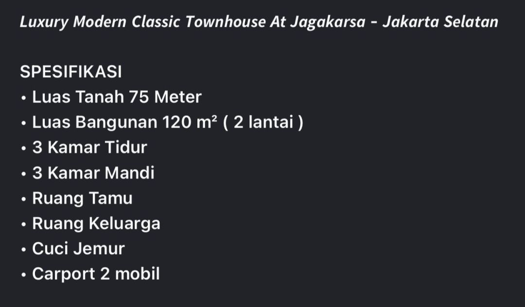 Rumah siap huni di kawasan Jagakarsa, Jakarta Selatan. Luas tanah 75m² dan luas bangunan 120m², dilengkapi 3 KT & 3 KM. Harga mulai 2,3 Miliar. Proses cepat.