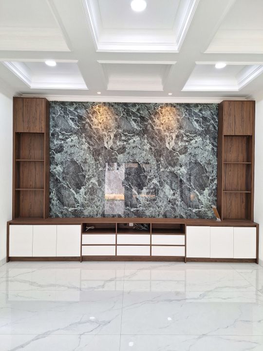 Lantai Utama: HT Slab ukuran masif 90x180 (Sangat sedikit sambungan, kesan luas).