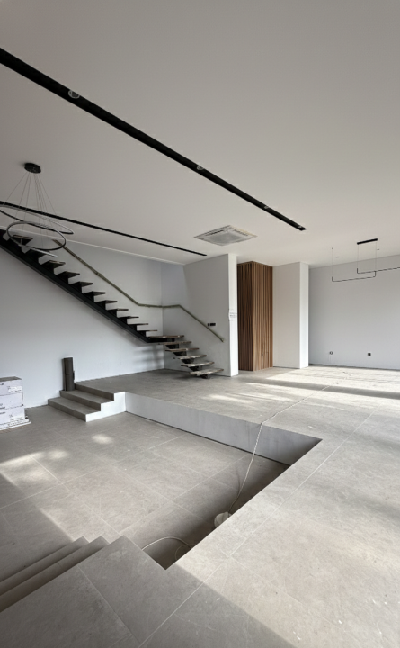 * High ceiling + designer lighting