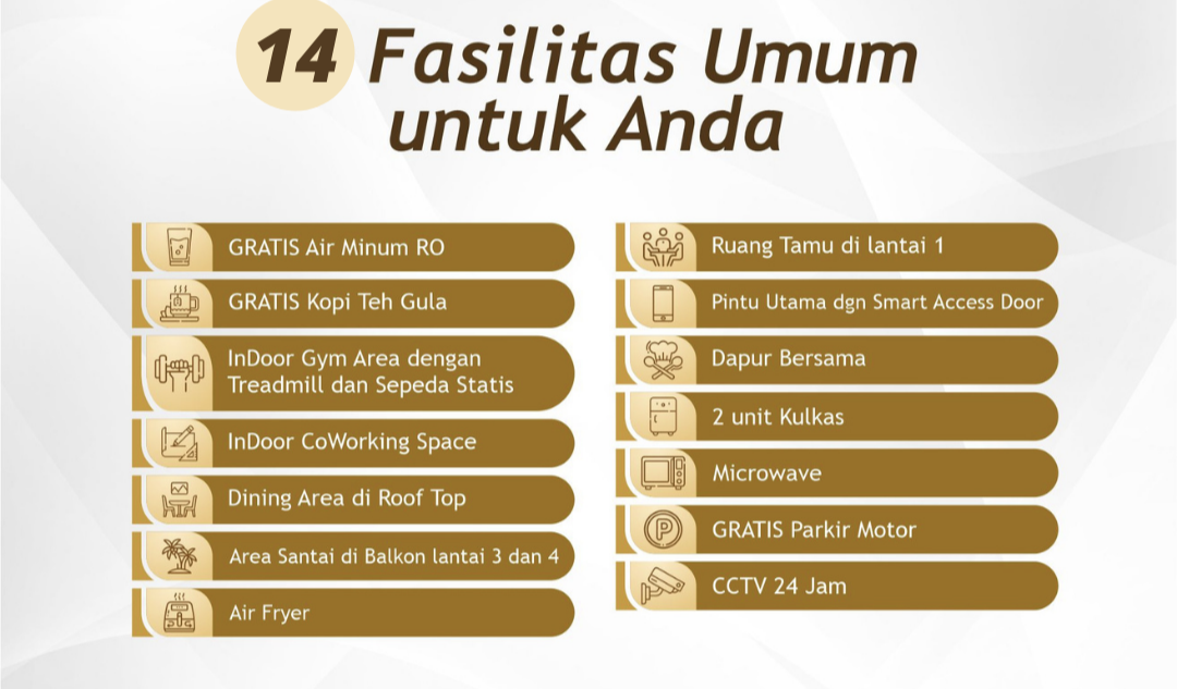 Ruang Tamu, Mini Gym, Indoor Co Working Space, Roof Top Dinner Area, 2 Balcony Area