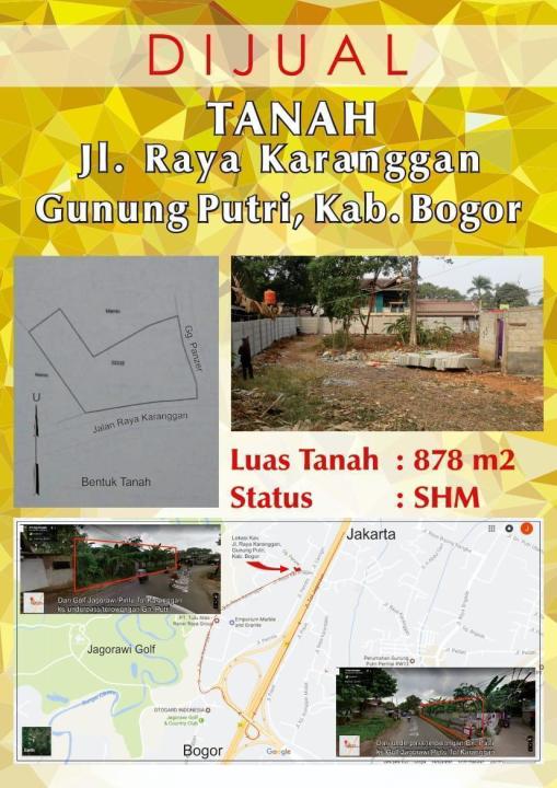 Dijual Cepat Lahan Komersial Industri & Usaha Siap Bangun yang terletak sangat strategis di pinggir Jl. Raya Karanggan, Gunung Putri, Kabupaten Bogor