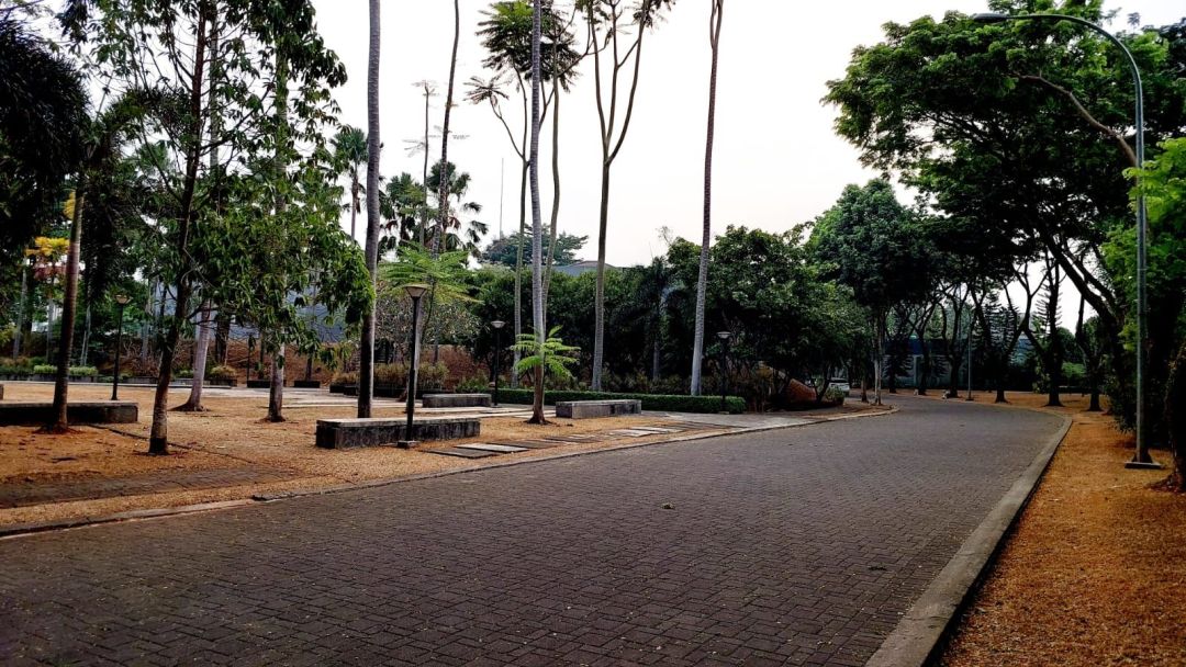 Hadap Utara, di samping Taman.